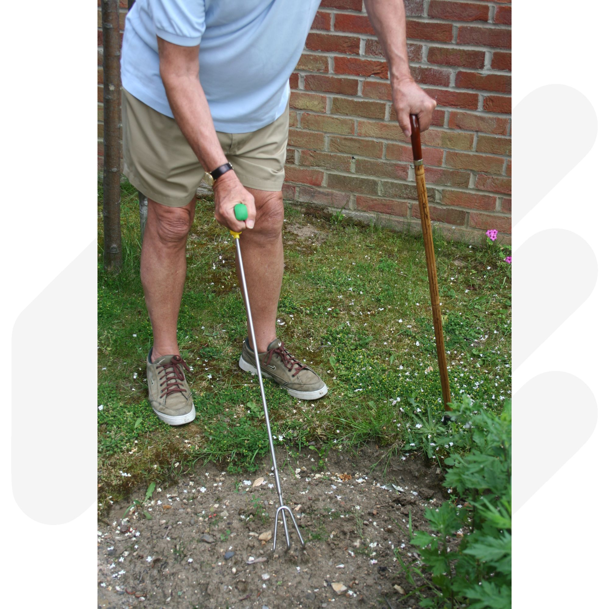 Extended handle — reach ground level with less bending or stretching.